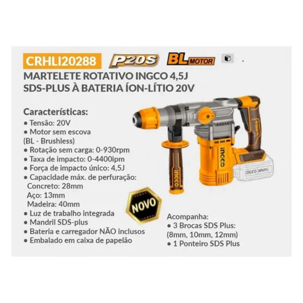 Martelete Sem Fio Sds-Plus Crhli20288 S/Bat e Carreg Ingco